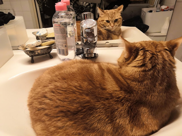 Joskus on hyvä onnitella myös itseään ja nyt on sen aika. Häpeilemättömästi kerron, että onnistumisen tunne on ollut ylitsevuotava vaikka samaan aikaan pieni ajatus päässäni sanoo, että mikset nyt tuota aikaisemmin keksinyt, asiahan on itsestään selvä. No, niin tai näin, onnittelen silti itseäni siitä, että keksin tyhjentää ulkotarhasta sinne vievän ikkunan lähellä olevasta hyllyköstä yhden hyllyn kissoille ja laittaa sen päälle pahvin. Sellaisen kynsienraapimapahvin. Mikä neronleimaus!